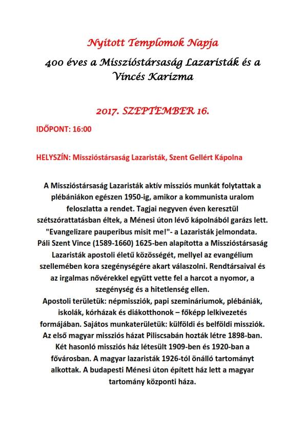 Nyitott Templomok Napja a Lazaristáknál